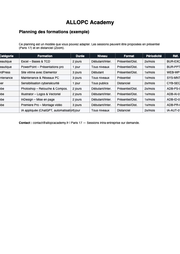 ALLOPC Academy propose des formations pratiques et opérationnelles en bureautique, web, maintenance, cybersécurité, Suite Adobe Creative Cloud et IA.